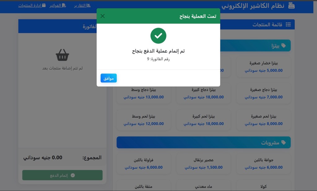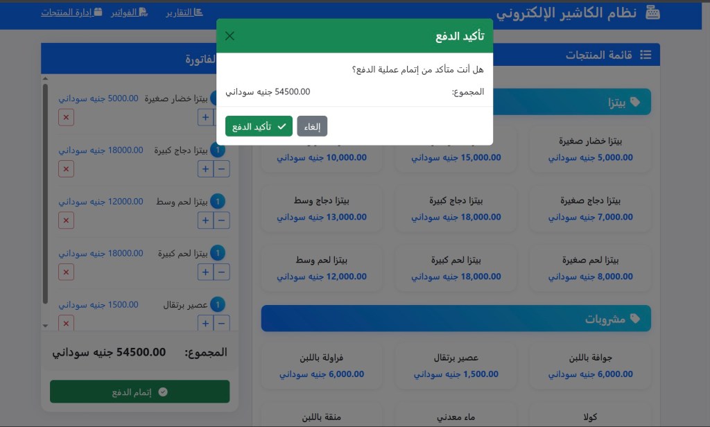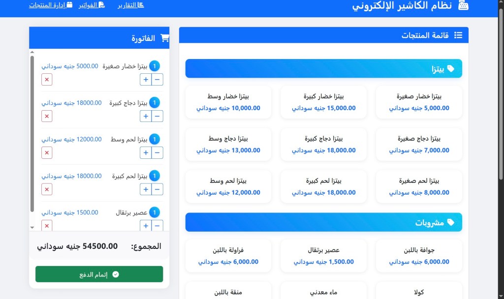 نظام الكاشير الإلكتروني هو حل متكامل وسهل الاستخدام، مصمم خصيصاً لتلبية احتياجات المطاعم، المتاجر، والمقاهي في السودان. يقدم النظام واجهة سلسة وبديهية تساعد في إدارة عمليات البيع، المخزون، والفواتير بكفاءة عالية وبدون أي تعقيد.